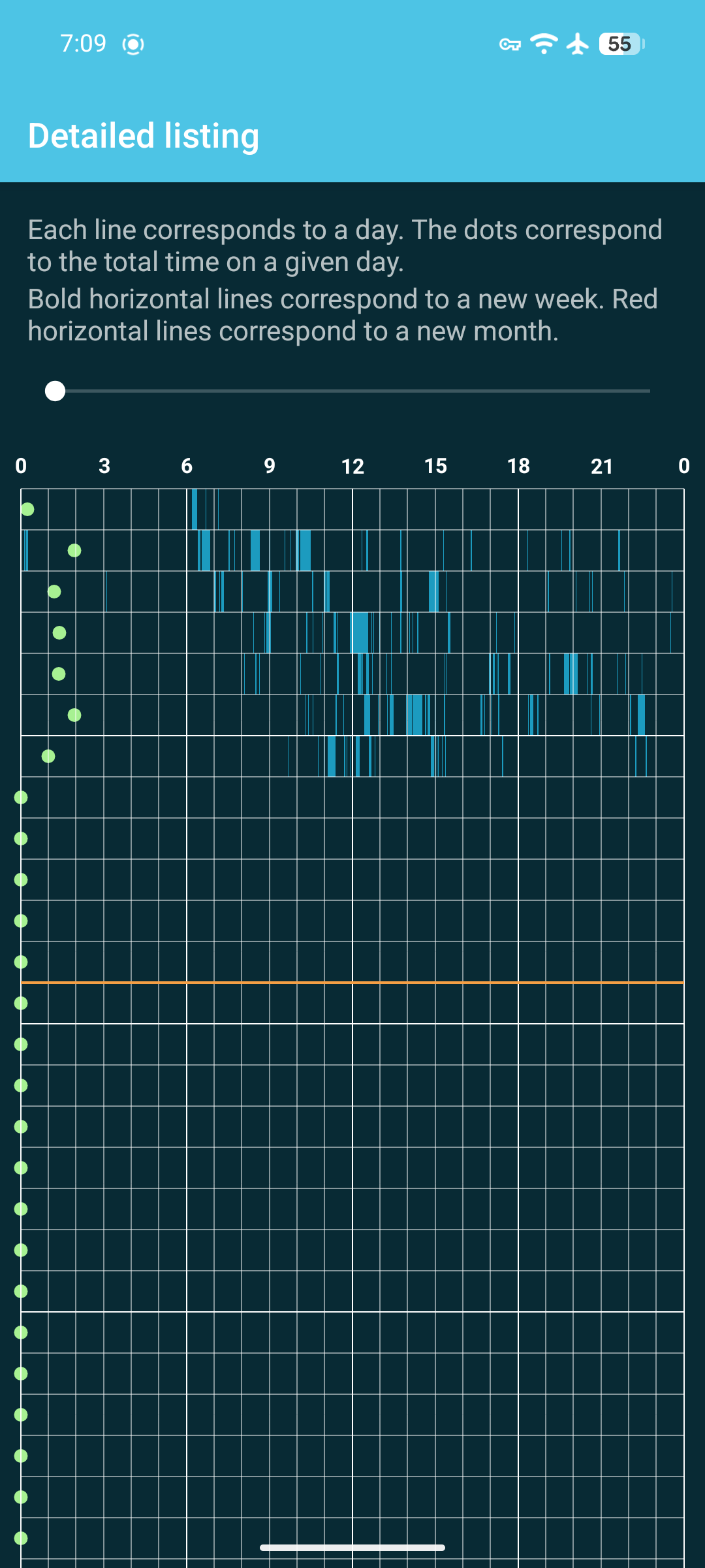 The second page is a 'Detailed listing', which presents historical information in a graph. Here you can get a sense of your trends from the present up to three months ago. Each horizontal row represents a day, segmented into hour intervals within six hour sections. More blue lines indicate when within each hour interval you were looking at your device, and a green dot indicates the total amount of screen time for that day. As the app tracks your usage, this Detailed listing view is a handy way to understand your personal trends.
